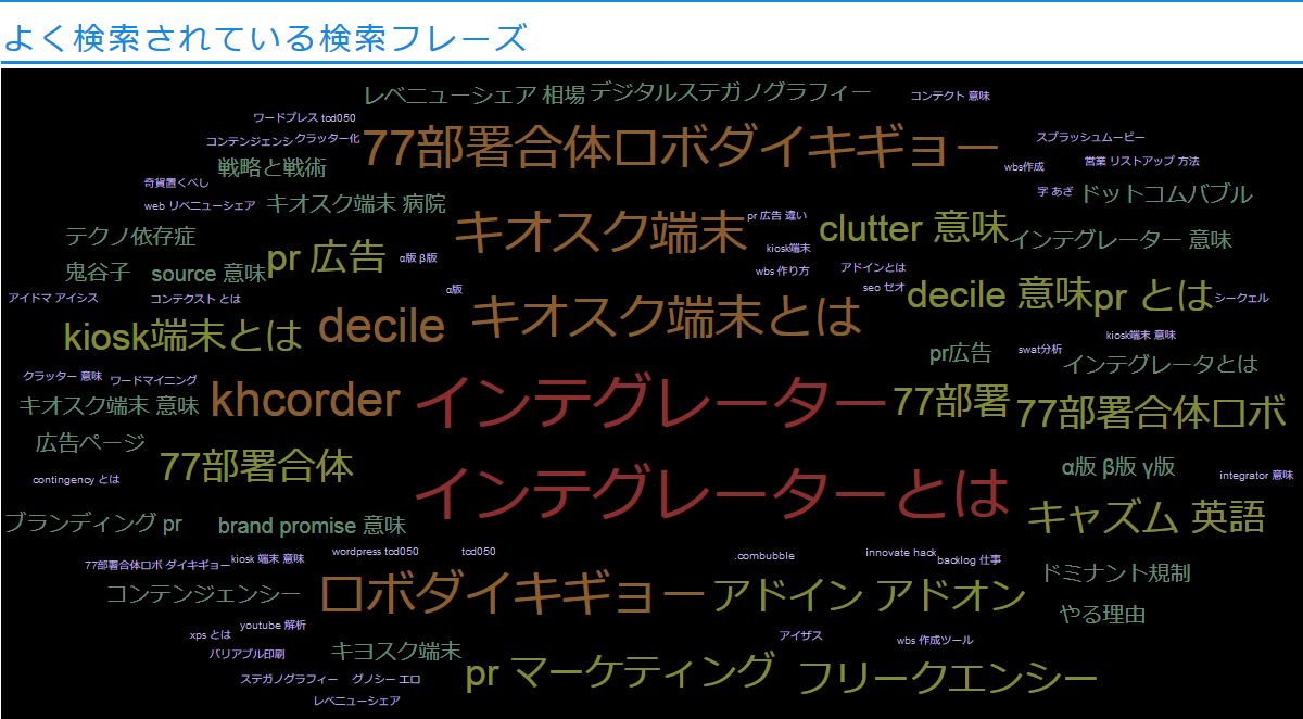 上記の「検索キーワード」をクリックしてみると、「よく検索されている検索フレーズ」というページが開き、キーワードクラウド?とでも言うのか、キーワードが並んだページに飛びます。