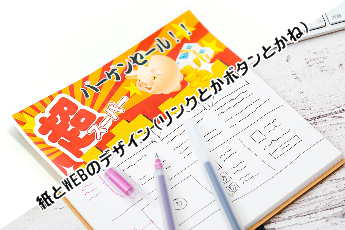 紙のチラシや冊子などのデザインで「ボタン」などをデザイン上で表現はすることはあるでしょうが、ユーザーも紙面上のボタンを実際に押したり、クリックすることってのはありません。紙系のデザインで高級感のあるデザインで作成というリクエストのなかで、なるほど、「ボタン」や「スイッチ」のデザインは高級感を損なう可能性があり、「ボタン」よりは装飾されたゴージャスな感じの「帯」のほうが合います。それともしかしたら、紙面のデザインに「リンクを埋め込んで実際にボタンとして機能するオブジェクト」を表現するという発想に至らない、またWEB制作をやるにあたって、通常考える「この色にすると、このボタンサイズだと、角丸のほうが、円のほうが、クリック率が高い」といった機能性やクリックのしやすさ、とかは紙面デザインの際には考えないもんなぁ・・・と(紙面は紙面で別のことを考えますけどね。それは後述)。