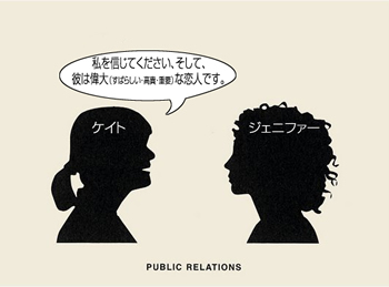 次に「PR=パブリックリレーションズ」です。普通に「PR」の方が聞き覚えあるかと思います。ケイトがジェニファーに