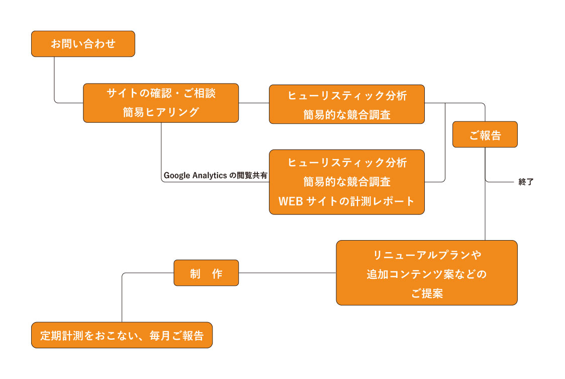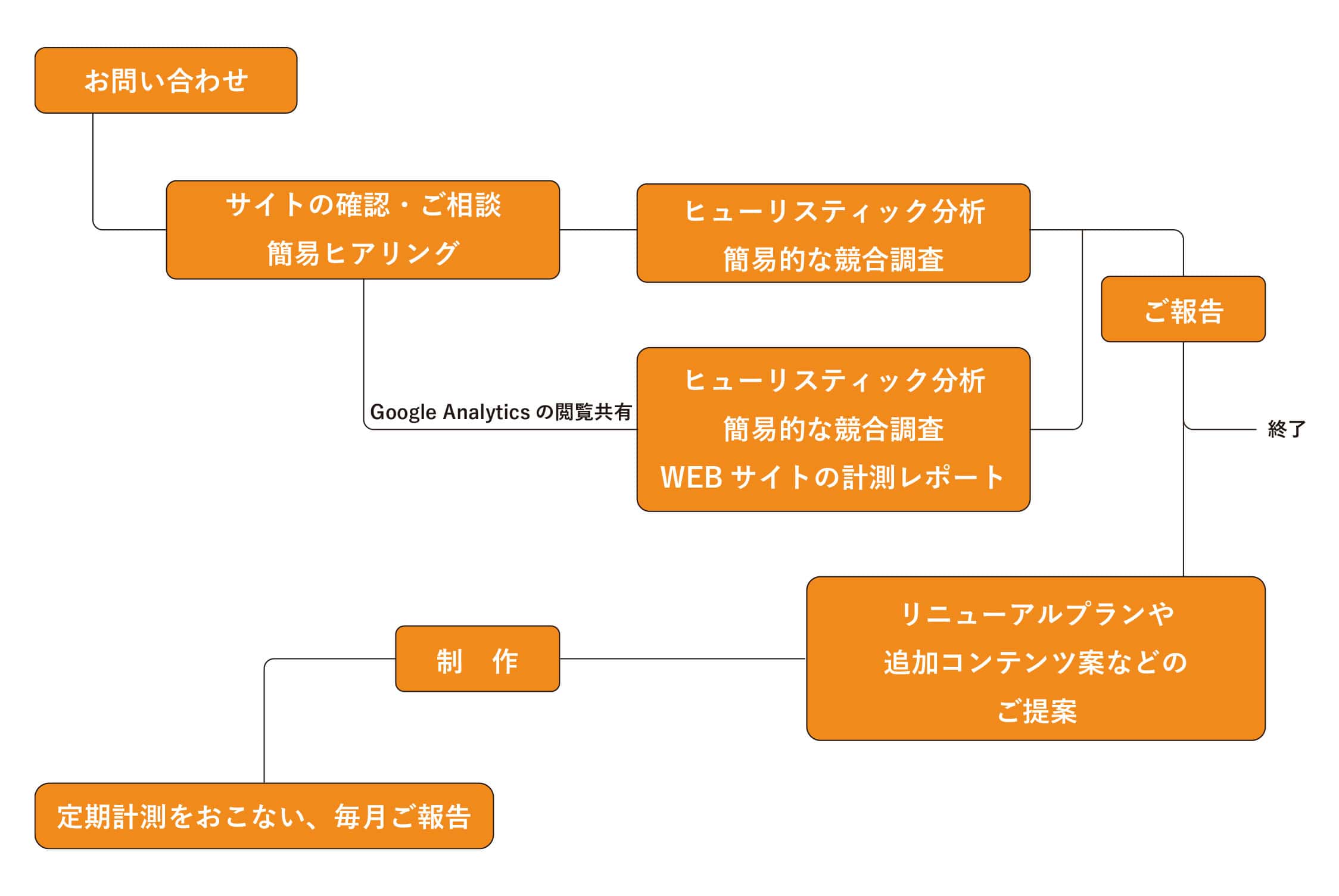 もし、サイトのリニューアルも、ということであれば、提示させていただいたリニューアルプランを元にお打ち合わせなどですり合わせをおこない、実際の制作に入っていき、納品後は保守メンテナンス、毎月の定期計測などをおこないます。